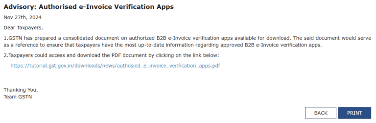 1.GSTN has prepared a consolidated document on authorized B2B e-Invoice verification apps available for download. The said document would serve as a reference to ensure that taxpayers have the most up-to-date information regarding approved B2B e-Invoice verification apps.