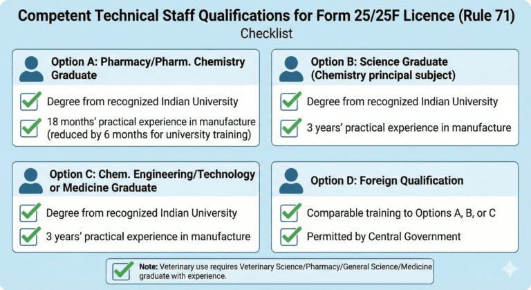 Science or Pharmacy or General Science or Medicine of a University recognized by the Central Government and who has had atleast three years’ practical experience in the manufacture of drugs excluding graduate in Pharmacy who shall have at least eighteen months’ practical experience in the manufacture of drugs: