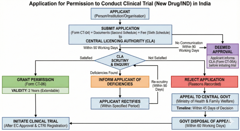 (1) Any person or institution or organisation which intends to conduct clinical trial of a new drug or an investigational new drug shall make an application to the Central Licencing Authority duly filled in Form CT-04.