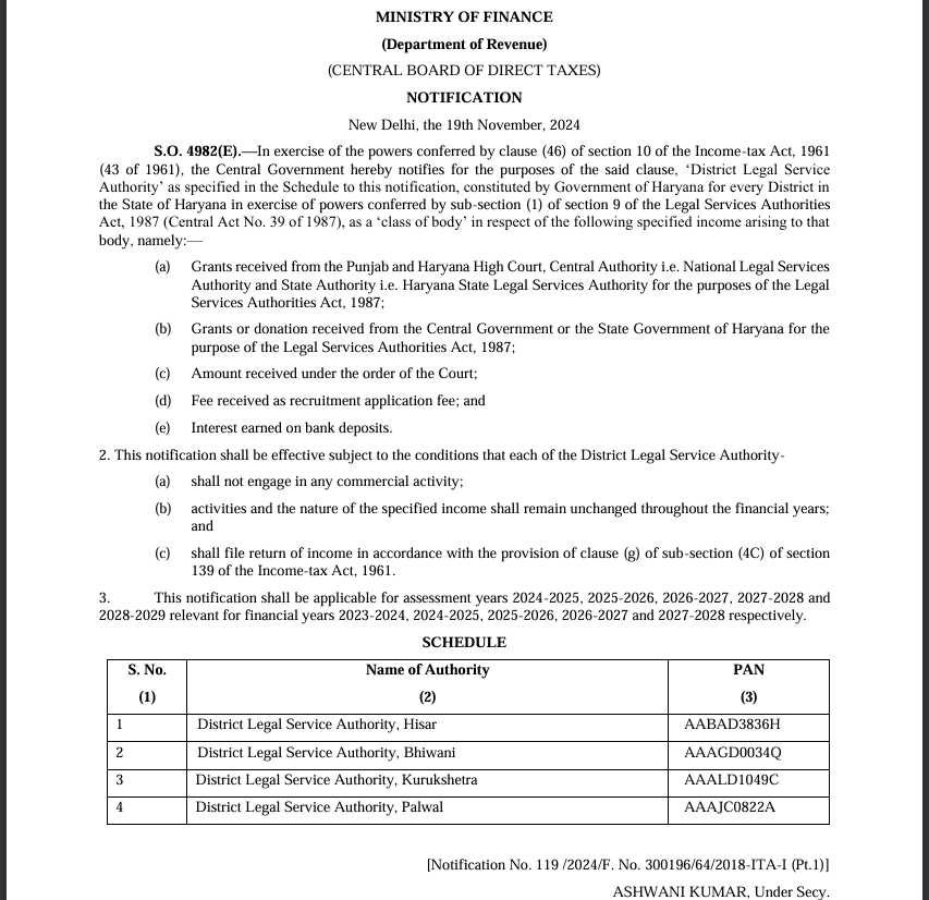 The Central Government, under Section 10(46) of the Income-tax Act, notifies District Legal Service Authorities (Haryana) as a class of bodies exempt from tax on specified incomes such as grants, court-ordered amounts, application fees, and bank interest, subject to conditions like non-commercial activities.