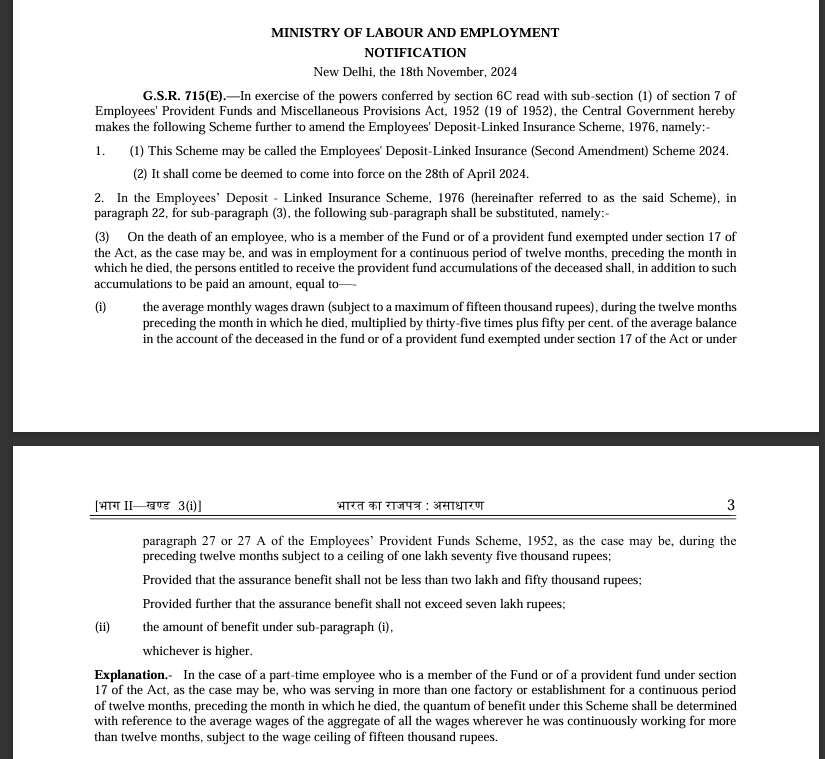 The Central Government has amended the Employees’ Deposit-Linked Insurance Scheme, 1976, through the Employees’ Deposit-Linked Insurance (Second Amendment) Scheme 2024, effective from April 28, 2024.