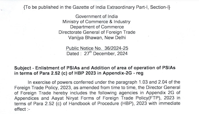 Nine (09) agencies have been designated as PSIAs. Additionally, the areas of operation and instruments for six (06) existing PSIAs have been notified. The mapping of equipment to respective areas of operation/countries has been extended to all PSIAs.