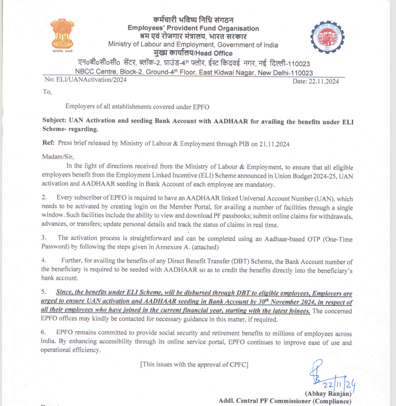 4) Employers must ensure UAN activation and Aadhaar seeding for their employees by 30th November 2024, starting with the latest joinees, to avail benefits under the ELI Scheme.