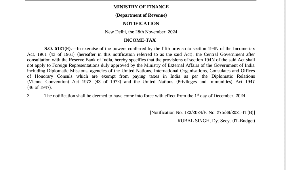 The Central Government, in consultation with the Reserve Bank of India, has issued a notification exempting Foreign Representations approved by the Ministry of External Affairs (such as Diplomatic Missions, United Nations agencies, International Organisations, Consulates, and Offices of Honorary Consuls) from the provisions of section 194N of the Income-tax Act, 1961. These entities are exempt from paying taxes in India under the Diplomatic Relations (Vienna Convention) Act 1972 (43 of 1972) and the United Nations (Privileges and Immunities) Act 1947 (46 of 1947). The notification is effective from December 1, 2024.