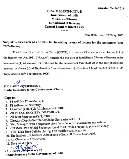 To facilitate a smooth and convenient filing experience for taxpayers, the original due date for filing ITR on 31st July 2025 is extended to 15th September, 2025.