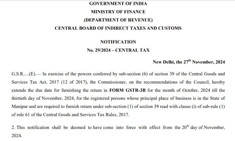 The due date for filing GSTR-3B for October 2024 is extended to November 30, 2024, for registered persons in Manipur under Section 39(1) of the CGST Act, 2017. This notification is effective from November 20, 2024.