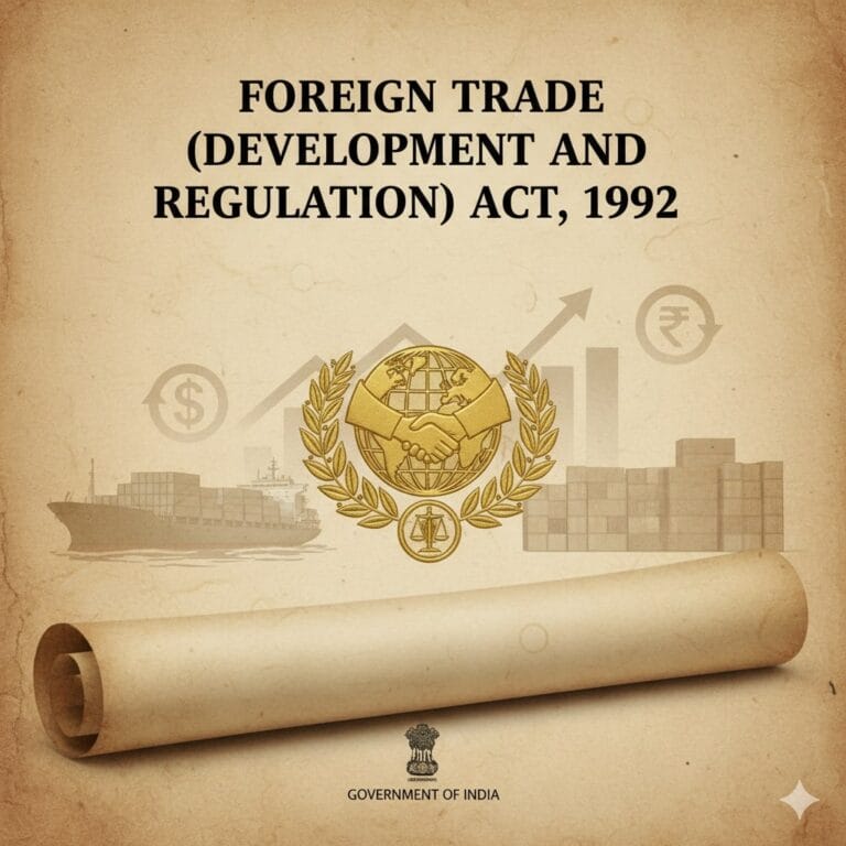 The Foreign Trade (Development and Regulation) Act, 1992 (FTDR Act) was enacted to provide the legal framework for the development and regulation of India’s foreign trade. It replaced the earlier Imports and Exports (Control) Act, 1947 to align India’s trade regime with global practices after the liberalisation policies of 1991. The Act empowers the Central Government to make provisions for the development and regulation of foreign trade, prohibit, restrict, or regulate imports and exports of goods, services, and technology, and to issue notifications, orders, and policies in the interest of national economy, security, and foreign relations.
