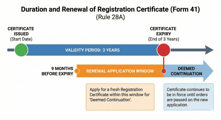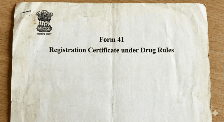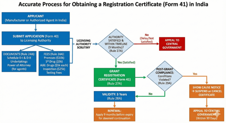In legal purview, “Registration Certificate” means a certificate issued under rule 27A by the licensing authority in Form 41 for registration of the premises and the drugs manufactured by the manufacturer meant for import into and use in India.