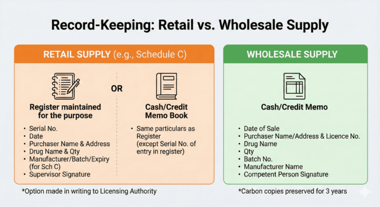 When supplying a drug (other than Schedule X) on the prescription of a Registered Medical Practitioner, the following must be recorded at the time of supply in a Prescription Register: