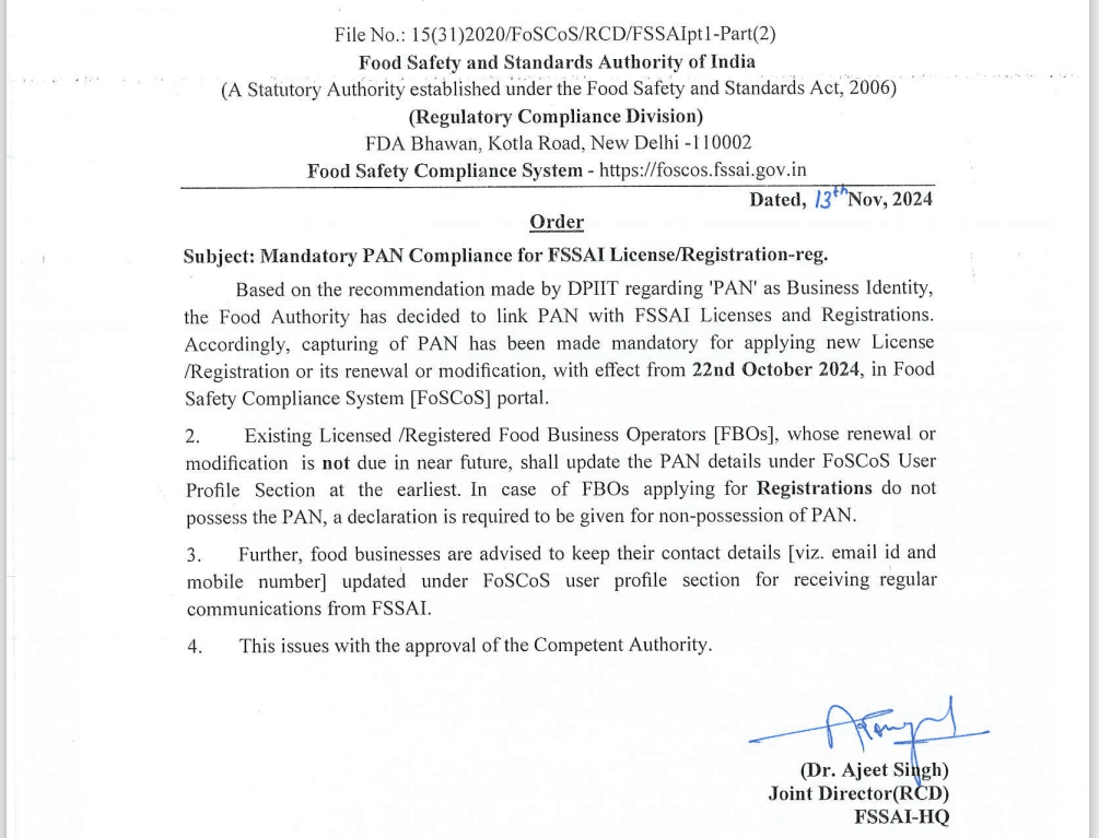 Existing Licensed/ Food Business Operators(FBOs) whose renewal/modification is not due in near future are required to update their PAN on the FoSCoS portal under FoSCoS User Profile Section as soon as possible.