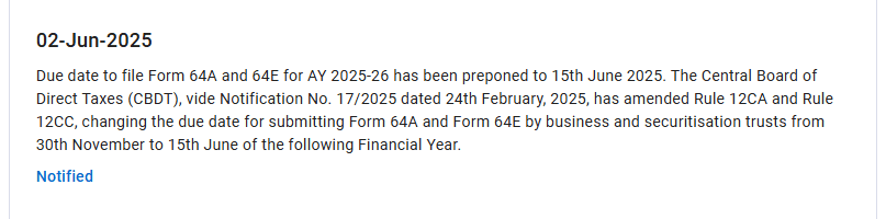 The due dates for furnishing Forms 64A and 64E have been revised from 30th November to 15th June of the following financial year. This change applies from AY 2025–26 onwards.