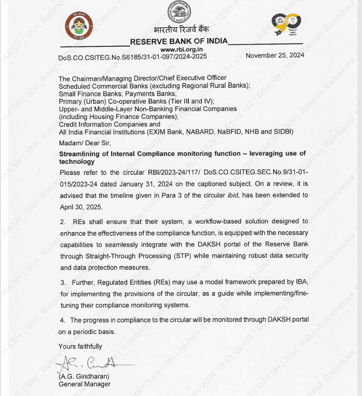 The Reserve Bank of India (RBI) has extended the deadline for streamlining the internal compliance monitoring function from October 31, 2024 to April 30, 2025. Regulated Entities (REs) must ensure their systems are capable of integrating with the RBI’s DAKSH portal using Straight-Through Processing (STP), while maintaining strong data security. REs can follow a model framework provided by the Indian Banks’ Association (IBA) for implementation. Compliance progress will be monitored periodically via the DAKSH portal.