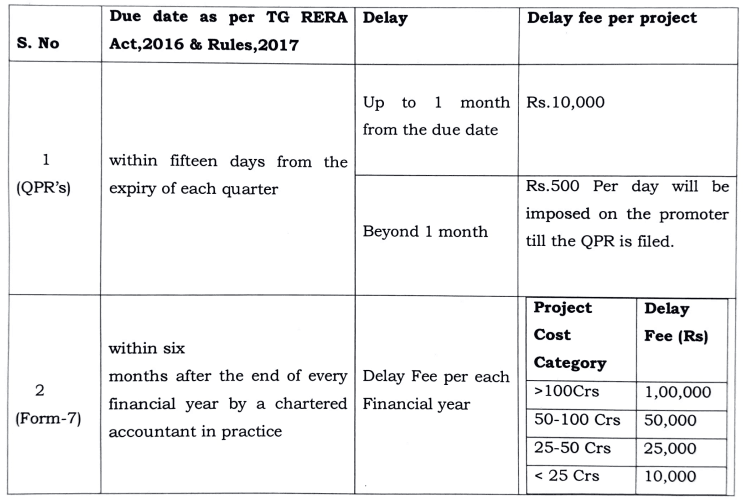 To ensure compliance, TG RERA has announced a strict late fee structure effective April 1, 2025. Promoters must clear all pending QPRs by March 31, 2025. Failure to do so will result in a late fee of Rs. 500 per day from April 1, 2025 until submission.