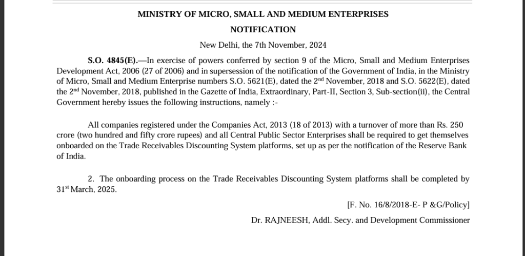 1.) All companies registered under the Companies Act, 2013 (18 of 2013) with a turnover of more than Rs. 250 crore (two hundred and fifty crore rupees) and all Central Public Sector Enterprises shall be required to get themselves onboarded on the Trade Receivables Discounting System platforms, set up as per the notification of the Reserve Bank of India.