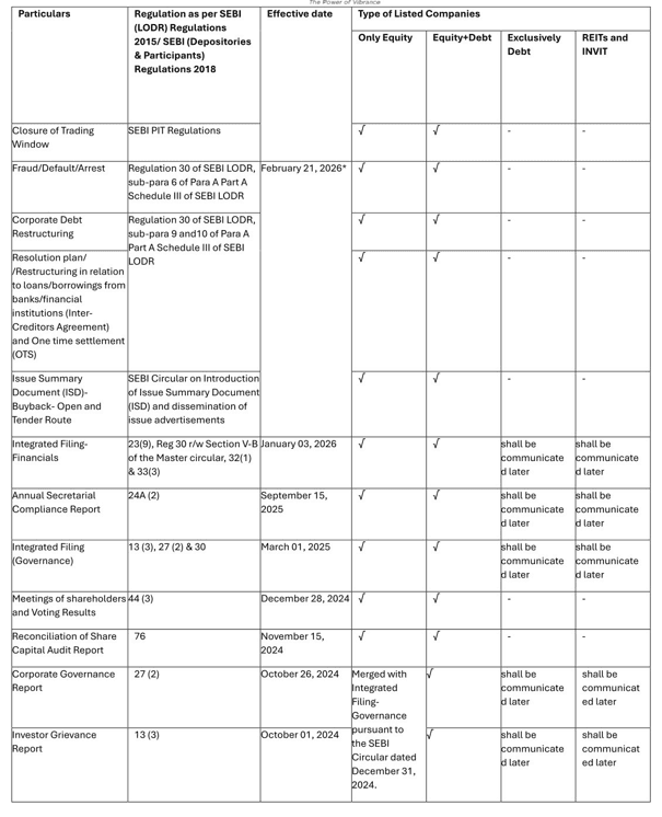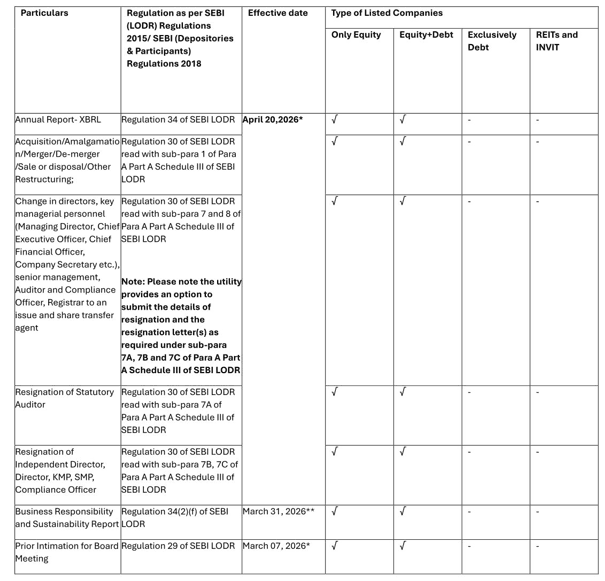 *Please note that the listed entities will continue the PDF filing of the aforesaid events of Regulation 29, Regulation 30 of SEBI LODR, Regulation 34(1)(a) of SEBI LODR, and disclosure for Trading Window, at both the Exchanges and the same will not be covered under single filing until further notice.